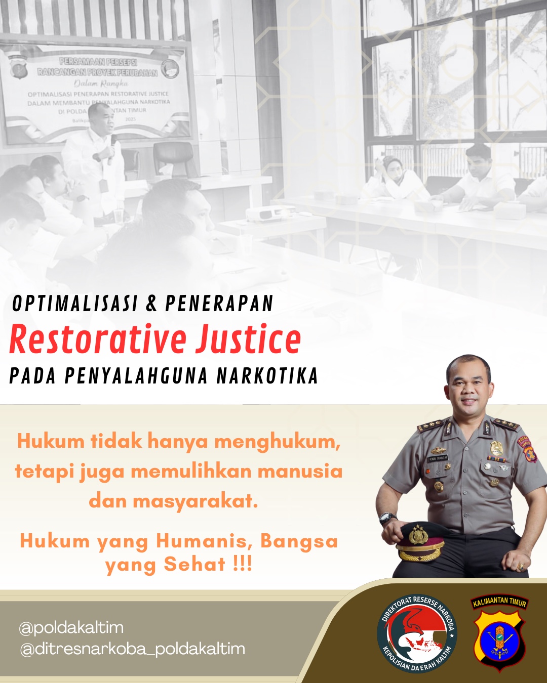 Melalui konsep Restorative Justice, Polda Kalimantan Timur berupaya menyeimbangkan antara penegakan hukum dan upaya rehabilitasi. Pendekatan ini mengakui bahwa penyalahguna narkotika memerlukan bantuan medis, psikologis, dan sosial untuk pulih dari kecanduan mereka.